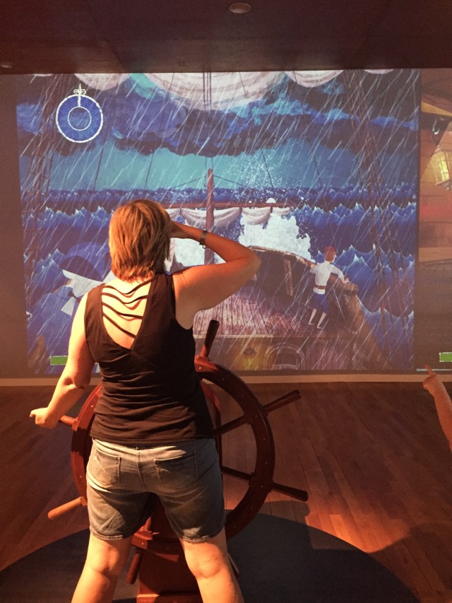The museum has an interactive session which lets children navigate a virtual ship. They can raise and drop sails, shoot pirates, pump out seawater and load booty or cargo. We put ours to work until they got hungry. Unfortunately the museum cafe was closed (for a wedding with 40 kids in attendance, see earlier post) so we had to pop outside to find a café where we could get a quick sandwich. Of course the concept of a quick sandwich is utter nonsense in Spain. We found nothing in existence except a local restaurant serving (at its own pace) the usual delicious tapas and wine. About four hours later we got back so that the smallies could do another round of VR shipwork. Ah, Sevilla – the home of long lunches!