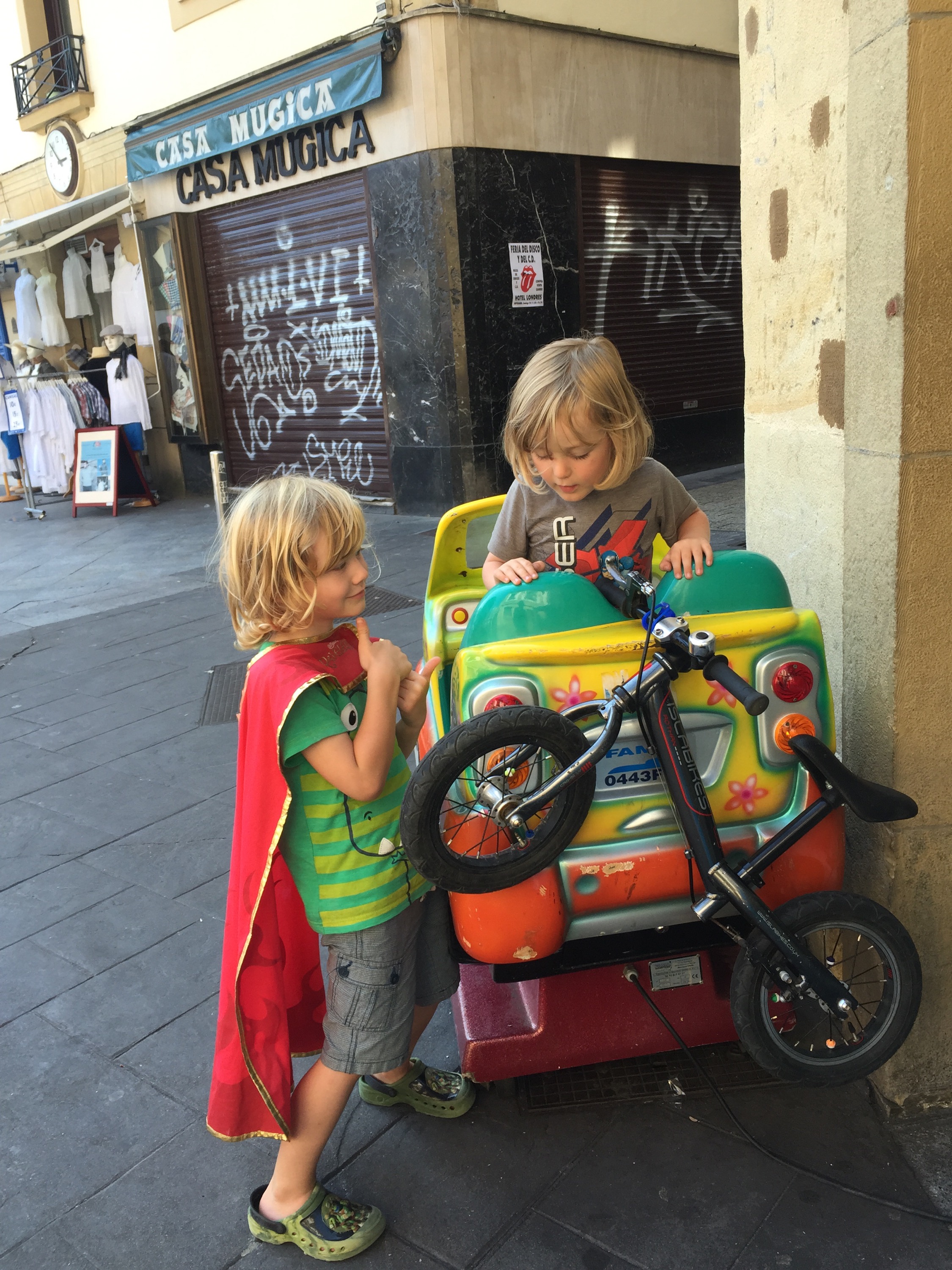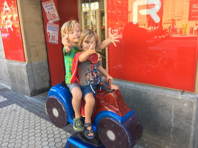 Speaking of food – Donostia restaurants collectively have earned 16 Michelin stars (the only place in the world with more is Kyoto, Japan) and eating out is practically a competitive sport, so deciding what and where to eat in this gourmet city was a Big Challenge. Luckily the Wild Berry Boys are easy enough to feed and they like to eat good Spanish staples like calamari, prawns, olives etc. They did have a few hungry moments but that was more to do with strange Spanish customary eating times than anything else. These are something along the lines of: first breakfast at 7am, second breakfast at 10am, lunch from 2pm to approx 4pm, siesta, snack at 6pm, dinner at 10pm. Small children are expected to partake in all meals. If you eat outside of these times, you are at great risk of being served bland tourist mush. The Wild Berry Boys adjusted but sometimes were quite happy eating bland mush as well. And all the playgrounds, fountains, carousels, motorbikes, cars, diggers and statues of Don Quixote provided great entertainment while the WBB mums hung out in Pintxos bars, that is to say, supervised carefully.